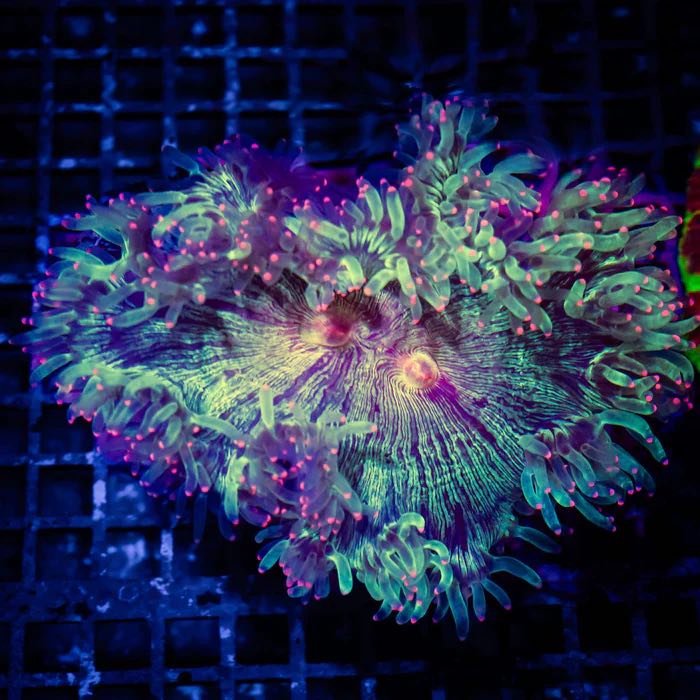 With its neon-green base, glowing pink tips, and intricate flowing tentacles, it’s a true statement piece in any reef tank. The way it extends and sways under gentle flow adds mesmerizing movement, making it a must-have centerpiece for coral enthusiasts.