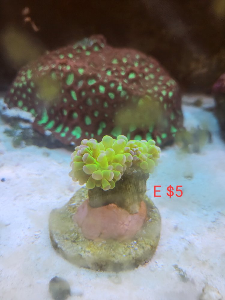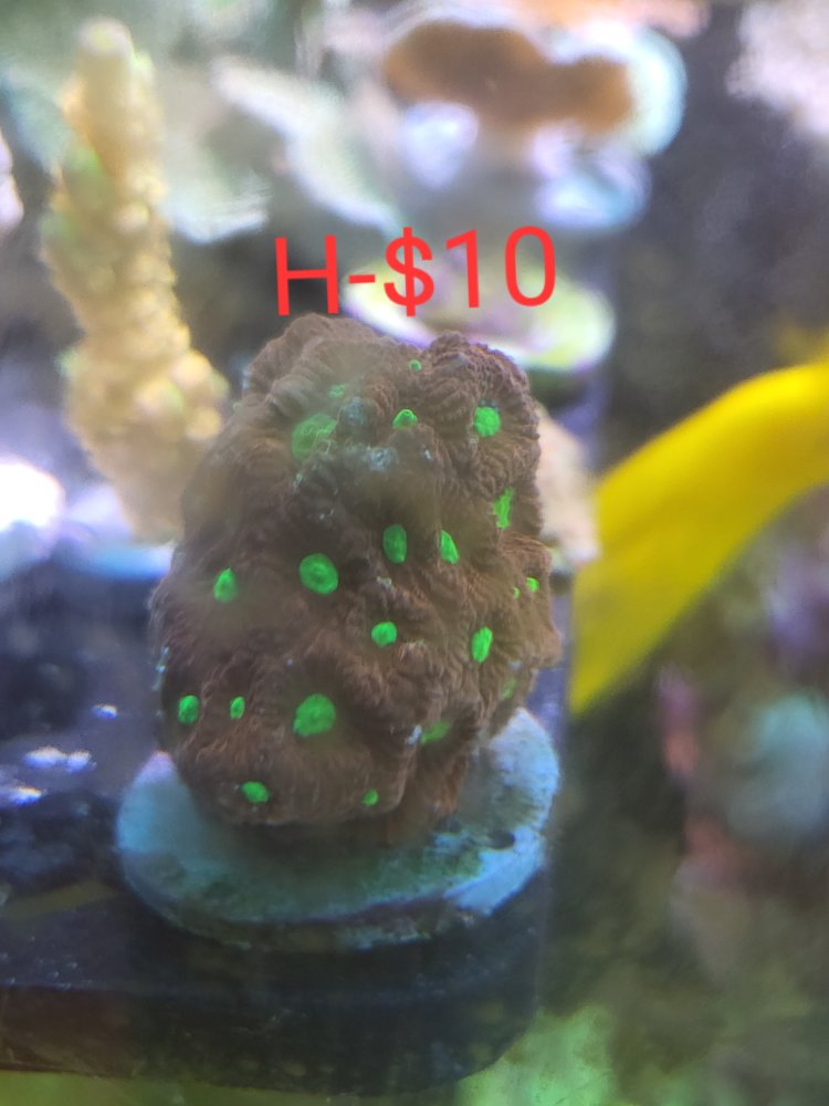 A - miami hurricane chalice frag pending B - grafted monti frag C-D-E - hammer frags E pending F- leptoseris G- tounge coral H- favia i-med toadstool gone J-large toadstool gone K- med green toadstool gone frogspawn $5 per head