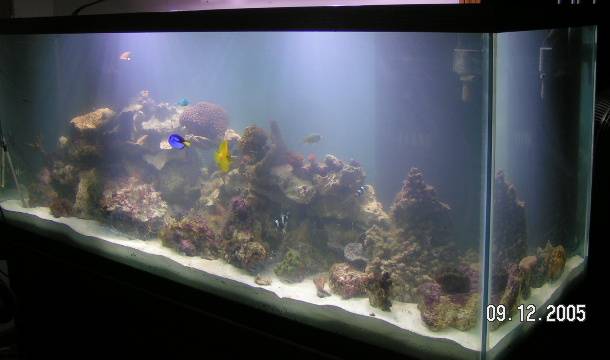 Well, it's been a long road, but finally after many postponements (for one reason or another) the 210 is finally sitting in it's place and looking beautiful, although a little cloudy. Many thanks go out to my B/F Mark and my kids for getting this monster tank into the house last night. I really think on the label that reads 210 MF that the MF stands for mother f*%#$# not mega flow because that's what it was to lift this tank. :D I also need to thank Kenlabonte182 and Alberto780 for bringing the 150 gallons of NSW today thathelped to fill this huge tank. You guys are the greatest!!!!! I'll be posting more pics in the near future....can't wait to fill this darn tank with corals!!!