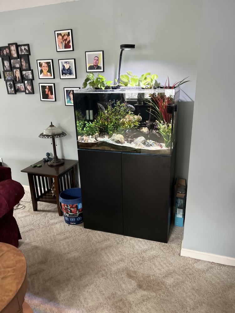Decided to upgrade to a bigger tank I set this up exactly a year ago as a freshwater tank ran for I think 8 months. No scratches I got it new . Includes tank stand sump made of glass with 2 -4 inch socks asking $1000 I can help you load it but pick up in Douglas mass .