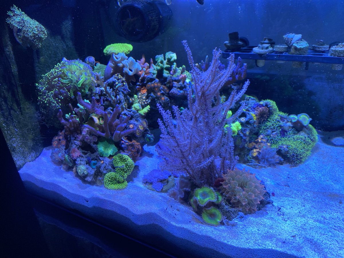 - Controller: Digital Aquatics Reefkeeper Lite with 2x power bars. Controls heater to 77F, lights simple on/off, rest of outlets to constant power.