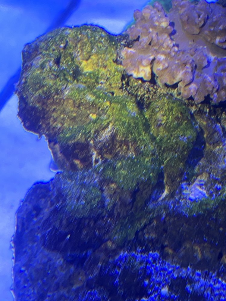 Have you heard of pop bloom lightsLooks like sponge or tunicates to me. Green stuff is just algae, dry rock starts white then turns brown/green with algae growth and then pink/purple with coralline if you have good lighting and parameters.