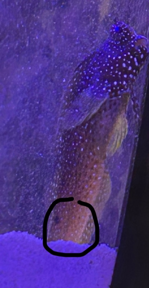 Hello, my starry blenny has a black dot and another one on the other side, today he didn’t eat algae at all, he rubbed against the sand bed, and he closes his tail when he stays still which was most of the day today. What do I do? Thank you: