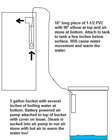 When the power went out during the ice storm two years ago I didn't loose anything. I was able to keep the water moving and warm the water. I have a gas stove so heating the water was easy. If I didn't I would have used my camp stove. Doing this will eventually ruin the $12 air pump but who cares, I have several. Here's a diagram of what I did.