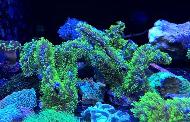 This store appears to have a branching morph of the beautiful yet aggressive grower, the green star polyp. They say they have had the mother from their display tank for many years and do not know where it came from. It seems to be living harmoniously with SPS since it grows up rather than enveloping all flight surfaces in sight.
