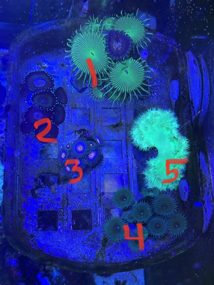 For sale the following Zoa mini colonies each with 5+ heads . Buy all 4 zoa colonies for $30. I don't know the names of any of them, sorry.